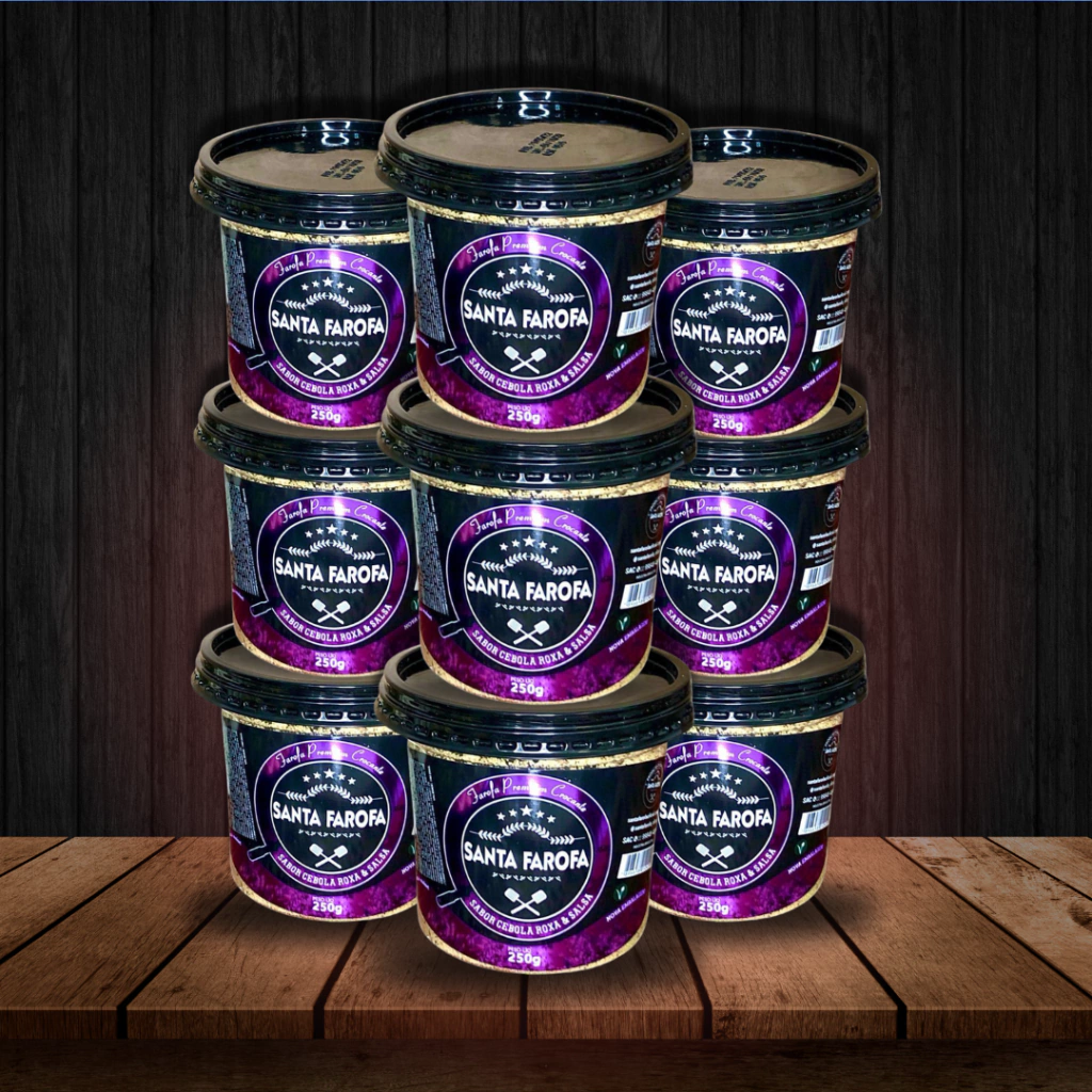 9 potes de 250g cada, totalizando 2,25kg de farofa sabor cebola roxa & salsa.