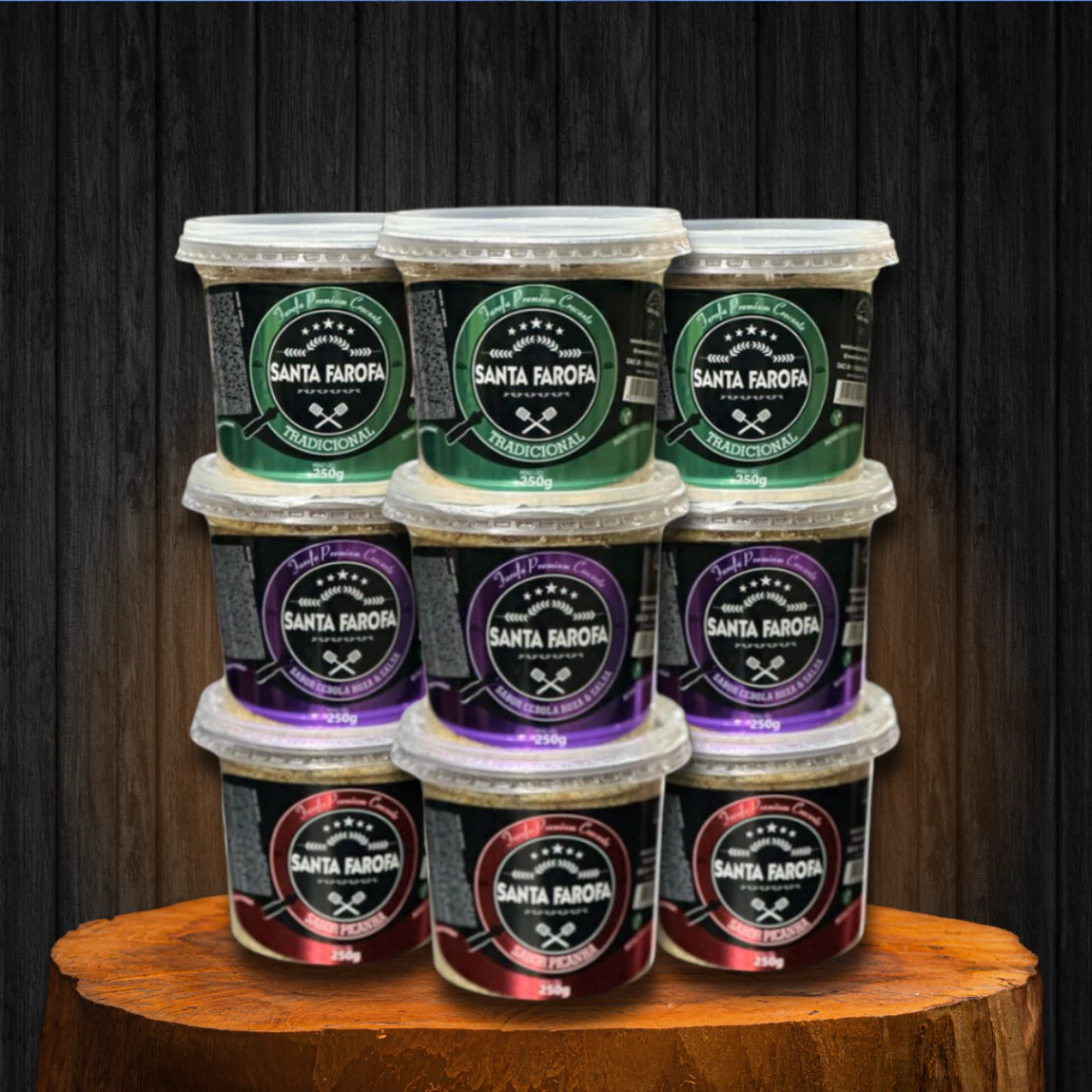 Variedade é o que define o Kit de Sabores Sortidos da Santa Farofa, com 9 unidades perfeitas para quem ama explorar diferentes gostos e texturas em suas refeições. Esse kit traz 3 unidades de cada um dos nossos sabores exclusivos – Tradicional, Picanha e Cebola Roxa & Salsa – para que você tenha à sua disposição a farofa certa para qualquer prato.